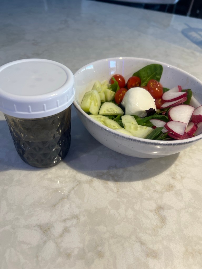 Then I found out how easy it was to make a universally acceptable, balsamic vinaigrette, which became acceptable all across the board of my household. I use it for salad dressings. I use it when I do a little chop vegetable medley. I use it with my tomato and cheese thing over here.