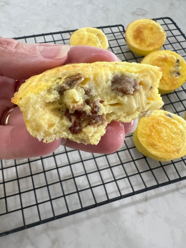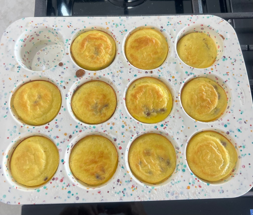 Top each tin with bacon and/or sausage (or heck, be healthy and top with a veggie if you want!). I did half bacon and half sausage (6 and 5).