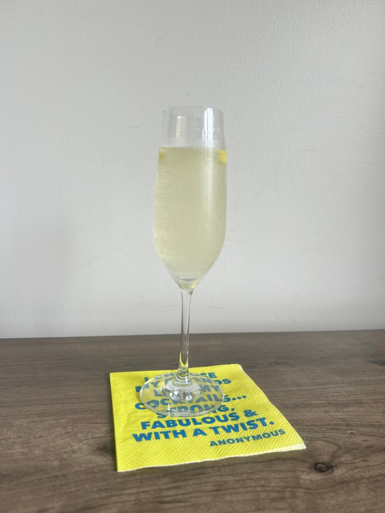 Strain in to a champagne flute. Top (slowly) with Prosecco. Garnish with lemon and serve up!