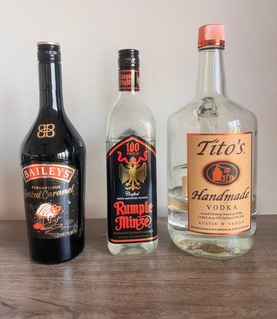 *I made these for a Christmas party we attended and just picked up this cute bottle … measures 2 cups vodka, 1 cup Baileys and 1 cup Rumple Minze. Brought another thousand of those shot glasses and was good to go!