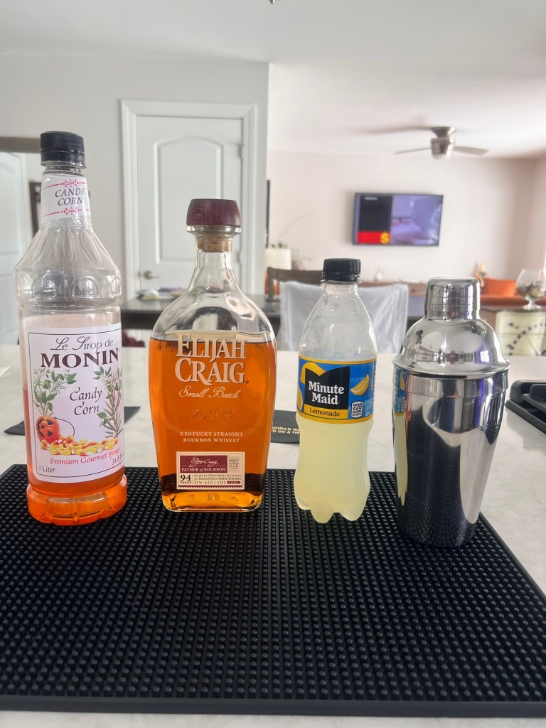 Answer: a little bit of bourbon, splash of lemonade and a squirt of Candy Corn.