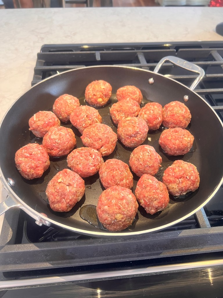After all the balls are formed, heat up some oil in a large skillet over low heat and add the balls, turning them as they brown. You don’t need to cook them all the way through just yet …