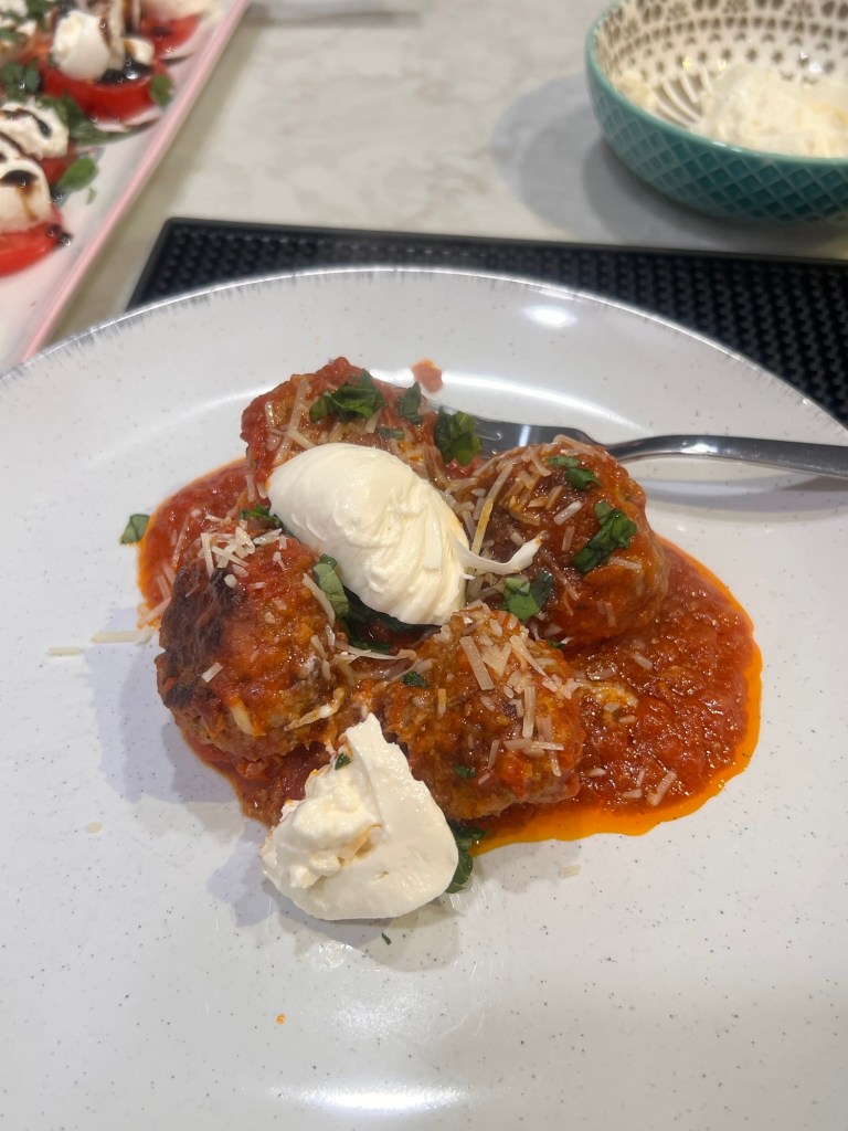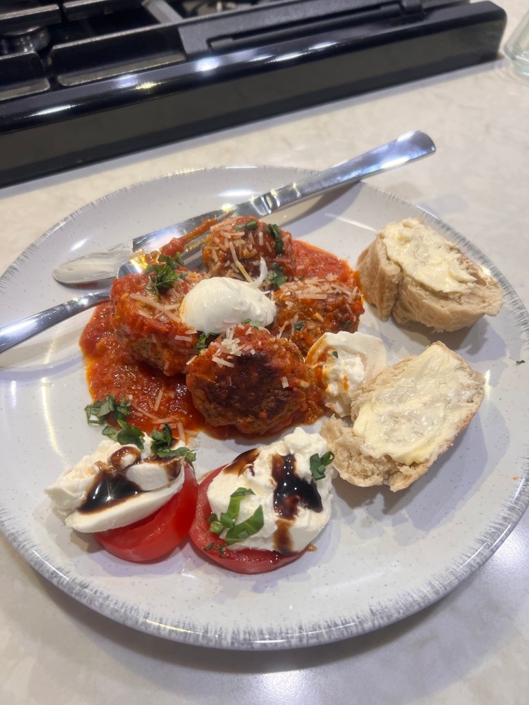 I made meatballs. 12 to be exact. AND I took an easier way out and used a jar of Raos instead of slaving away with cans of tomato sauce. AND finally used up a package of spaghetti that’s been hanging around the pantry for a long while 😉